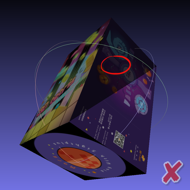 第二个立方体中阴影部分的面片的法向量是负值取向。这种面片在EasyAR中会当成不可见面处理。如果从里面看出去,会发现显示成第三个立方体的样子。模型应当避免一切负值取向的面片。